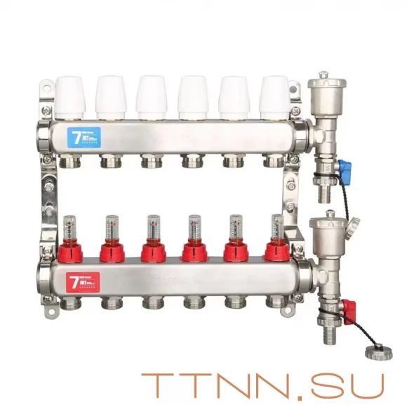 ViEiR Коллекторная группа, нержавеющая сталь 1" х 3/4", с расходомерами 7 выходов (5/1) VR113-07A. Артикул VR113-07A. Коллекторная группа применяется для передачи жидкости на контуры отопления и настройки в них мощности потока и температуры в системе "теплый пол", а также подключения радиаторов отопления, других тепловых приборов. Основные рабочие элементы это "две гребенки," - коллекторы подающего и обратного контура.
